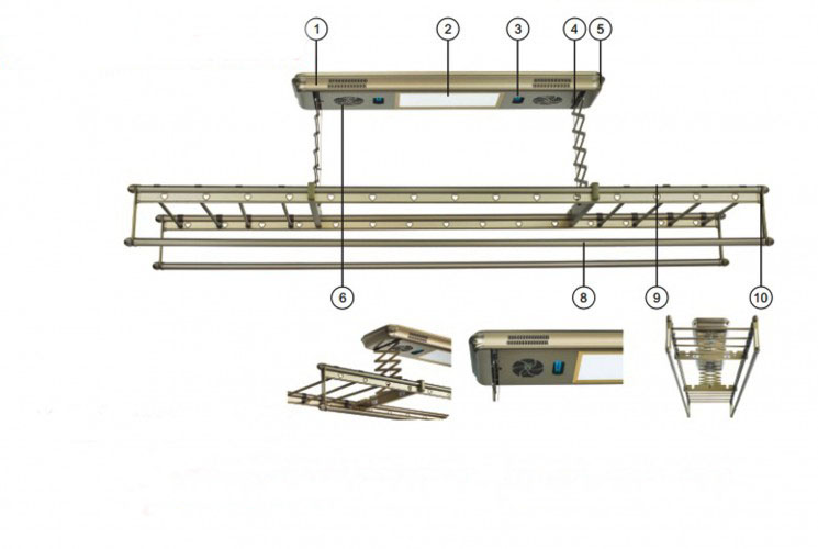 Giàn phơi thông minh điều khiển từ xa GLP750 được thiết kế với nhiều tính năng vượt trội hơn so với các mẫu giàn phơi thông minh gắn tường và giàn phơi thông minh gắn trần có tay quay và cả những mẫu giàn phơi thông minh điều khiển khác. Các bộ phận bao gồm thân máy, máy đèn led, đèn khử khuẩn, mặt máy, Zích zắc, Nắp máy, Cửa gió sấy khô, Kẹp đồ, Thanh phơi chăn, Lỗ thanh phơi gói gọn trong một bộ giàn phơi thông minh điều khiển từ xa GLP750 vô cùng nhỏ gọn, dễ dàng sử dụng hơn nhiều so với các mẫu giàn phơi thông minh khác.